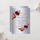 En el frente: un fondo falso de aspecto metálico plateado con un marco geométrico falso de oro. Decorada con flores oscuras de color burdeos y rosa, rosas y plumas de estilo boho. Plantillas para el nombre de la novia y los detalles del fiesta. El nombre está escrito con un guión de estilo con letras a mano, letras de color negro. Retroceso: fondo falso plateado metálico.