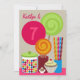 Una invitación de la fiesta de cumpleaños que ofrece un ilustracion de tres lollipops, de un tarro de gumballs, de un envase de caramelo del palillo, de un pedazo de chocolate, y de una magdalena. Personalice el texto en frente y la parte posterior.