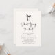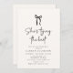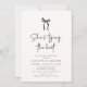 Invitación moderna y caprichosa a una ducha de novia con un ilustracion lúdico y un elegante guión con la frase "Ella está atando el nudo". El minimalista diseño blanco y negro crea una moda y una estética atemporal, perfecta para celebrar a la futura novia con estilo. Ideal para los amantes de un estilo moderno y romántico.