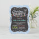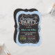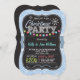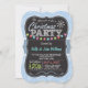 Cute retro brillante, colorido, divertido estilo de pizarra de Navidades invitación de fiesta sobre el patrón de copos de nieve azul claro. Cuenta con luces de globo azules, rojas, verdes y rosadas para Navidades y copos de nieve de invierno blancos. Los tipos de letra de tiza de época se perciben en el fondo fresco de la pizarra.