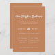 La noche anterior... Asegúrate de que todo sea perfecto para un gran día. Un tema de moda retro: adoptar este diseño tipográfico vintage y elegante para tu papelería boda, con un tema de color azúcares marrones. Fácil de mezclar y emparejar con nuestra papelería similar disponible en naranja quemado, terracota y rosa melocotón. Personalizable completamente los colores y fondos de texto.