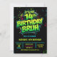 neon 14th birthday invitation, 14th birthday party, 14 fourteen, green black, gamer gaming tech computer pc, boys him tween preteen, modern contemporary, futuristic sci fiedgy urban, racing karts auto, blue green invitation,