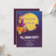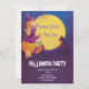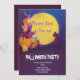 Invitación bruja sentada en la calabaza con la fiesta de Hall