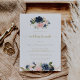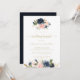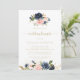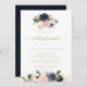 Esta invitación al brunch floral de boda dorado de color azul marino es perfecta para un evento rústico. El diseño está decorado con bonitos azules, azules, navales, rosas, ruidosas, doradas y verdes paisajes.