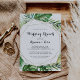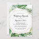 Este destino geométrico es una invitación al brunch boda tropical ideal para una familia y amigos día después del brunch boda. El diseño se compone de palmeras verdes de color agua pintadas a mano y hojas de plátano cuidadosamente dispuestas en bonitos ramos, adornando un marco geométrico dorado.