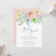 Invitación de brunch de boda floral encantadora con rosas, flores y vegetación pintada con colores suaves pastel junto con "Brunch de Boda" en una escritura elegante y delicada. El esquema de color principal es coral con un tono durazno subyacente. Esta invitación botánica de brunch de boda es perfecta para una celebración de primavera.