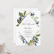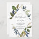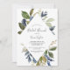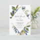 Esta invitación al brunch nupcial de otoño es perfecta para una ducha de boda en otoño. El moderno diseño rústico incluye hojas azul marino, verde salvia y dorado con brotes de flores azules oscuras.