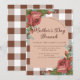 Invitación rústica Floral Brown Burgundy Mother's Day Brunch - Una invitación bellamente elegante y femenina de Brunch del Día de la Madre en un patrón de gingham marrón y blanco con adorables acentos florales de color burdeos y azul claro y una mezcla de caligrafía de escritura marrón y texto en bloque elegante. El lado inverso de la invitación tiene un patrón de gingham marrón a juego. Personalice los detalles de su evento. Todo el texto es editable. También disponible como descarga digital instantánea para enviarla fácilmente a través de mensajes de texto, correo electrónico o medios sociales.