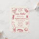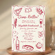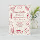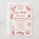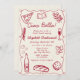 Un diseño fiesta de estilo retro, caprichoso y a mano, con un bonito color rojo vitivinícola, un alegre marco ondulado y ilustraciones de cocina italiana. Con elegantes fuentes con letras a mano, este diseño es perfecto para añadir un toque de estilo vintage a su evento. Ideal para las duchas de pareja o para las duchas de novias, sobre todo las que tienen un tema de pizza o pasta fiesta.