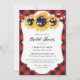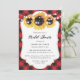 Una tierna invitación a una ducha de novias con flores de búfalo rojo enchapado en rojo con girasoles y luces de cuerda sobre un fondo de cuadros rojos. Elementos coincidentes disponibles.