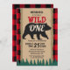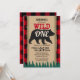 Invite a sus huéspedes con estilo con esta rústica invitación a la fiesta temática de 1 cumpleaños. Este diseño presenta un fondo de manta de búfalo rojo y negro con acentos de burrega bronceada. Un oso con las palabras Wild y Uno en la tipografía moderna decora la carta. Todos tus detalles para la celebración pueden ser personalizados. A continuación se muestra una hilera de pinos verdes que contribuyen a crear un ambiente de bosque. Diseñado por la artista ©Susan Coffey.