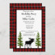 Esta rústica invitación de diseño de manto rojo y negro de búfalo es perfecta para él. El diseño también incluye abetos y una silueta de alce.