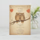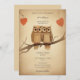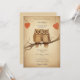 Lindos búhos enamorados. Personalice esta adorable invitación de boda es perfecta para una pareja que ama los búhos. La parte frontal de la invitación presenta una pareja de búhos sentados en una rama, con hojas en forma de corazones.