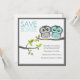 Estos anuncios divertidos de guardar la fecha presentan una ilustración vectorial adorable de una pareja de búhos posados en una rama de árbol. Muchos esquemas de color disponibles en nuestra tienda y más disponibles a petición.