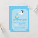 ¡Un pequeño paquete de alegría está en camino! ¡Celebremos con un día especial! Esta tierna invitación tiene un pequeño ave cigüeña haciendo un parto de un bebé en un paquete azul. El bebé está asomando alegremente fuera del bulto porque espera conocer a sus nuevos padres. Patrón de puntos polacos para el fondo.