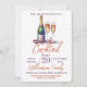 Una invitación a una fiesta de cóctel. Diseño de una botella de champán espumoso, vino burbujeante y 2 copas de flauta. Un hermoso diseño de celebración con texto naranja quemado y morado que invita a sus invitados a unirse a usted para una fiesta de bebidas festivas de vacaciones. Fácil de personalizar con los detalles de su propia fiesta.