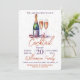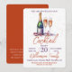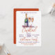 Una invitación a una fiesta de cóctel. Diseño de una botella de champán espumoso, vino burbujeante y 2 copas de flauta. Un hermoso diseño de celebración con texto naranja quemado y morado que invita a sus invitados a unirse a usted para una fiesta de bebidas festivas. Fácil de personalizar con los detalles de su propia fiesta.