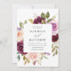 Elegantes invitaciones florales a bodas con un ramo de rosas acuáticos y vegetación en tonos ruidosos, melocotón, violeta, borgoña y verde. Los detalles de su boda se muestran en un cuadrado blanco en el centro de la invitación.