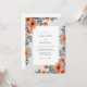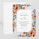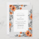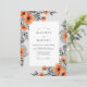 This design showcases vibrant burnt orange watercolor poppies paired with moody charcoal grey foliage. Soft grey artistic washes provide a contemporary backdrop for the delicate hand-painted botanical elements. The high-contrast palette evokes a sophisticated and modern atmosphere suitable for an elegant fall or summer event.