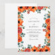This design features a vibrant arrangement of burnt orange anemones and roses that create a warm, inviting atmosphere. Accented with silvery sage green eucalyptus leaves and delicate berries, the botanical display offers a sophisticated touch to the white background. The rich autumnal color palette makes this a perfect choice for summer or fall events seeking a polished, floral aesthetic.