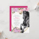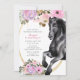 Esta invitación a caballo de cumpleaños incluye un caballo negro de bonito con flores rosadas y violetas. Se puede personalizar fácilmente con todos los detalles de su fiesta.