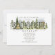 Ilustración de una casa rústica con marco en forma de A rodeada de árboles incorporada al texto 'Bachelorette'. El lado opuesto tiene un diseño de textura de madera.