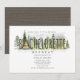 Ilustración de una casa rústica con forma de A rodeada de árboles incorporada al texto "Bachelorette". El lado opuesto tiene un diseño de grano de madera.