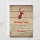 Invitación de cumpleaños con estilo rústico. Diseñada con una cabeza de ciervo con cuernos, hecha de cuadros rojos. Un marco ovalado elegante rodea la imagen. Las tablas de madera falsas le dan un ambiente campestre.