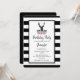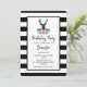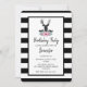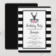 Una invitación de cumpleaños con una cabeza de ciervo negro con grandes cuernos. Líneas geométricas dentro de la cara del ciervo agregan un toque creativo. Coloridas flores rosadas y hojas verdes de menta forman un bonito ramo floral debajo de su cabeza. Un boceto de una cordillera colocado entre las flores también agrega al ambiente rústico de campo. El fondo es un patrón de rayas negras y blancas.