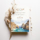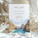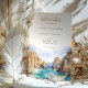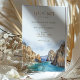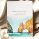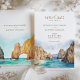 Anuncie su día especial con esta hermosa tarjeta "Save the Date" que presenta una escena acuarela de Cabo San Lucas, México. La carta muestra el icónico Arco de Cabo contra las serenas aguas turquesas, con cálidos tonos arenosos y ricos acentos dorados-marrones que le dan profundidad y carácter. El cielo combina suaves tonos azules y blancos cremosos, lo que le da a la carta un ambiente romántico y de ensueño. La combinación de fuentes modernas con un guión elegante añade un toque de sofisticación, lo que lo hace perfecto para una celebración de bodas de destino. La parte trasera de la tarjeta sigue el estilo acuático, manteniendo un aspecto cohesivo y artístico que refleja la belleza de la península de Baja.