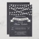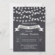 Cadena de luces y banner vintage en el pizarrón de verano boda invitación a la ducha de novia con una cuerda brillante blanca en la parte superior de las luces y un banner blanco vintage con contorno negro en la pizarra o fondo de pizarra. Este moderno y moderno diseño boda con elementos vintage forma parte de un conjunto o colección de bodas, es completamente personalizable y es perfecto para un boda rústico de verano al aire libre.