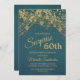 Invitación a la fiesta de cumpleaños número 60 para las mujeres con brillantes luces de cuerda de oro y chisporroteo en un audaz fondo verde azulado. Esta invitación está diseñada para una dama que está celebrando su cumpleaños número 60, pero el texto, los tipos de letra y la redacción son completamente personalizables. Así que diseñe sus invitaciones para cualquier edad. Contáctenos para obtener ayuda sobre la personalización o la correspondencia de productos.