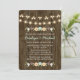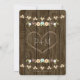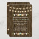 Este diseño forma parte de una serie rústica de flores de otoño con luces invitación a la boda en tonos verde azulados azul acuático con menta, verde, marrón, blanco, amarillo y marrón, con un bonito fondo de madera que recuerda a una cerca o a un barril de madera. Una corona de laurel otoñal compuesta de bellotas, bayas, girasoles, rosa de tulipanes y flores blancas se sienta en una rama arbolada. La parte posterior de la invitación puede ser personalizada con las iniciales de la novia y el novio dentro del árbol tallado se ve el diseño del corazón. Perfecto para una caída al aire libre, noche, campo, casa de campo, patio de labranza o moda rural de las parejas con temática de boda ducha de compromiso. Las bonitas luces de mimbre y de hadas con un efecto bokeh son luminosas, dulces, cálidas y acogedoras. Pintura © Chrissy H. Studios, LLC. Todos Los Derechos Reservados.