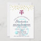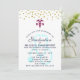 Una invitación para una celebración de graduación de enfermería. Diseñado con puntos de confeti dorado falso a lo largo de la parte superior. Un símbolo de caduceo rojizo purpúreo con las letras R N a ambos lados.