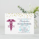 Invitación para una celebración de graduación de enfermería. Diseñado con puntos de confeti dorado falso a lo largo de la parte superior. Un símbolo de caduceo rojo violáceo con las letras R N a cada lado. Un estetoscopio azul pastel detrás del texto de la fiesta.