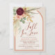 Celebra que la novia esté con esta invitación a la ducha de novias Fall in Love, que incluye un elegante ramo floral de color caoba con flores de crisantemo rojo burdeos, rosas rosas rosas rosas rubias, vegetación eucaliptus, plumas faisanas de pampas secas, hojas de otoño doradas y más. El diseño está enmarcado por un elegante y moderno arco en cálido naranja de terracota y beige de avena suave para un ambiente natural y terrenal. Con su moderno estilo rústico de boho, esta invitación marca el tono perfecto para una celebración otoñal. Parar con carteles de coordinación, tarjetas de agradecimiento, juegos, favores y decoración de la suite de eventos Fall in Love para una ducha de novia bellamente cohesionada este otoño.