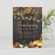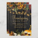 Hermosas flores de otoño oxidadas naranjas y burgundy oscuro y bordes de calabaza con hilos de luces brillantes doradas sobre un fondo de madera de granero marrón oscuro creando una encantadora invitación a la cena de Acción de Gracias con amigos con una tipografía dorada de escritura a mano de moda. +++++++++ Fácil de personalizar con tus detalles! Adecuado para reuniones tradicionales rústicas de granja en el campo al aire libre en el patio trasero con familiares y amigos. Descarga digital disponible