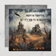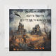 Un espantapájaros de calabaza aterradora deambula por un camino de jack-o-lantern, lejos de un par de casas embrujadas mientras los murciélagos vuelan sobre él en esta invitación a una fiesta de Halloween para adultos. Podría ser utilizado para una fiesta de adolescentes. La parte trasera es gris desgastada, con detalles de la fiesta.