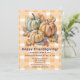 Celebra la temporada con este diseño de otoño acogedor que presenta tres calabazas en verde salvia, beige y crema rodeadas de hojas de otoño. El fondo a cuadros cálido naranja y blanco añade un toque rústico de granja, perfecto para la decoración de Acción de Gracias, invitaciones o regalos de temporada. ¡Una forma encantadora de decir “Feliz Día de Acción de Gracias” con estilo otoñal!