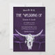 Estas plantillas de tarjetas planas de invitación casera de personalizado blanco morado oscuro, rústico occidental, 5x7, presentan un diseño de textura rústico de campo de cráneo de vaca toro de rodeo. El estilo vintage del Barn de estilo salvaje del oeste antiguo fresco, diseño de animales de granja de moda. Derechos de imagen de Marg Seregelyi Photography.