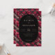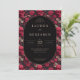 Esta invitación de boda presenta un llamativo tema gótico-romántico con un intrincado patrón floral y de cráneos sobre un fondo negro. El diseño muestra rojos intensos, rosas apagados y grises oscuros, creando una atmósfera macabra pero elegante. Un marco ovalado centra el texto, que se presenta en una fuente serif formal, lo que realza el ambiente de boda tradicional al tiempo que añade un toque único y atrevido. Perfecta para parejas que buscan una apariencia memorable y distintiva, esta invitación combina la belleza con la morbidez para celebrar su día especial.