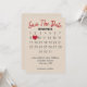 Calendario de "guardar la fecha" con corazón rojo en fondo bronceado claro relevado para próxima boda. El texto es editable. El mes se puede cambiar. Coloque el corazón rojo en la fecha de su boda.
