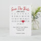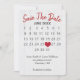 Calendario de "guardar la fecha" con corazón rojo sobre fondo de madera rústica blanqueada para una próxima boda.