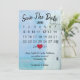 Calendario de "Guardar la Fecha" con corazón rojo en un diseño de faro y océano de acuarela para una próxima boda.