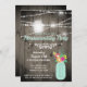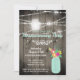 Madera rústica de granero, luces y jarrones de albañil invitaciones a la casa - Anteojos de madera de granero secos y angustiados. Luces románticas de cuerda y farolillos de tarro de albañil de campo adornan la parte superior. En la esquina inferior derecha hay un tarro de albañil de menta lleno de ramo de flores silvestres. Lee 'Por favor únanse a nosotros para un Fiesta que calienta la casa' en igualar el verde de la menta con el aspecto de la sombra. Un elegante borde de desplazamiento separa la introducción de los detalles del fiesta. La parte posterior tiene un aspecto rústico de madera.Nota Todas las imágenes están impresas. Utilice el botón Ti Personalizar para cambiar cualquier cosa: estilos de fuente, tamaños, colores o ubicación. Bonito, rústico tarro de albañilería invita a las casas de menta a colores fiestas, rústicos o con tarros de albañilería, fiestas de la casa de campo, limpieza de casas al aire libre o celebración de cambio de hogar en primavera o verano. Tenemos más invitaciones de estilo rústico en nuestra tienda Zazzle.com/angela65. Hermosas, elegantes y rústicas invitaciones para fiestas de campo listas para ser personalizadas.