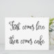 Un simple y hermoso cartel de caligrafía que dice "Primero viene el amor, luego viene la torta". Este cartel hecho a mano se puede utilizar para añadir un estilo moderno en recepciones de boda o en cualquier fiesta para indicar el bar de cócteles.