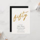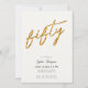 Una plantilla de 50 años con un fondo blanco y dorado, un cristal, moderno, elegante y moda, una invitación a la fiesta de 50 años con un fondo blanco (negro en la parte trasera de la tarjeta), la palabra "cincuenta" cubierta con un purpurina dorado (este es un efecto digital), un guión moderno de caligrafía y una tipografía en tonos dorados. Una moda, un diseño atemporal para una mujer en su cincuentenario cumpleaños.
