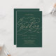 Esta romántica caligrafía verde en una sola invitación matrimonial es perfecta para un simple boda. El moderno diseño clásico presenta vistosos remolinos y florituras con una preciosa y elegante tipografía de Relieve metalizado de oro con chaflán a mano con letras falsas y oro. Guarde el papel incluyendo los detalles en la parte posterior de la invitación a la boda en lugar de en una tarjeta separada. Incluya también la información de RSVP si su invitado responderá electrónicamente (opcional). Nota: Este diseño no tiene Relieve metalizado oro real. Es un gráfico de alta calidad hecho para parecer un Relieve metalizado dorado.