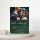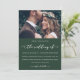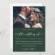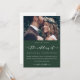 Elegante invitación a bodas verdes y blancas. Esta simple invitación es una forma de moda de hacer saber a los invitados de su próxima ceremonia matrimonial. Esta invitación de moda presenta el encantador guión de "el boda de" caligrafía blanca sobre un fondo verde oscuro con la foto de la pareja, y una parte trasera blanca de la tarjeta.