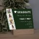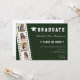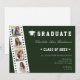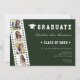 Invite a los huéspedes a la fiesta de graduación de su hijo con esta moderna Invitación a la Casa Abierta de cuatro Collages de fotos Green Filmstrip. El diseño de la invitación incluye una tira de película y cuatro fotos, adornos de tapón de graduación con un guión elegante y una tipografía. Añadir fotos y detalles de la casa abierta al personalizar. El color de fondo del reverso de la invitación puede cambiarse para complementar la foto o para añadir el color de la escuela.